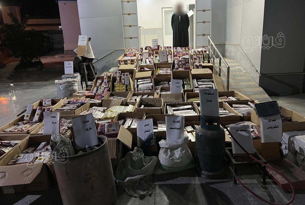 وعقب تقنين الإجراءات تم إستهدافه وأمكن ضبطه حال تواجده بمسكنه المُشار إليه، وعُثر بحوزته على ( 50 كرتونة ألعاب نارية بإجمالى عدد مليون و150 ألف قطعة ألعاب نارية مختلفة الأحجام – 10 كيلو نترات – 50 كيلو بارود خام – كمية كبيرة من فوارغ الصواريخ معدة للتعبئة – كمية كبيرة من الشرائط اللاصقة والمقصات – كمبروسر هواء – إسطوانة بوتاجاز – ميزان – ماكينة طحن وخلط).