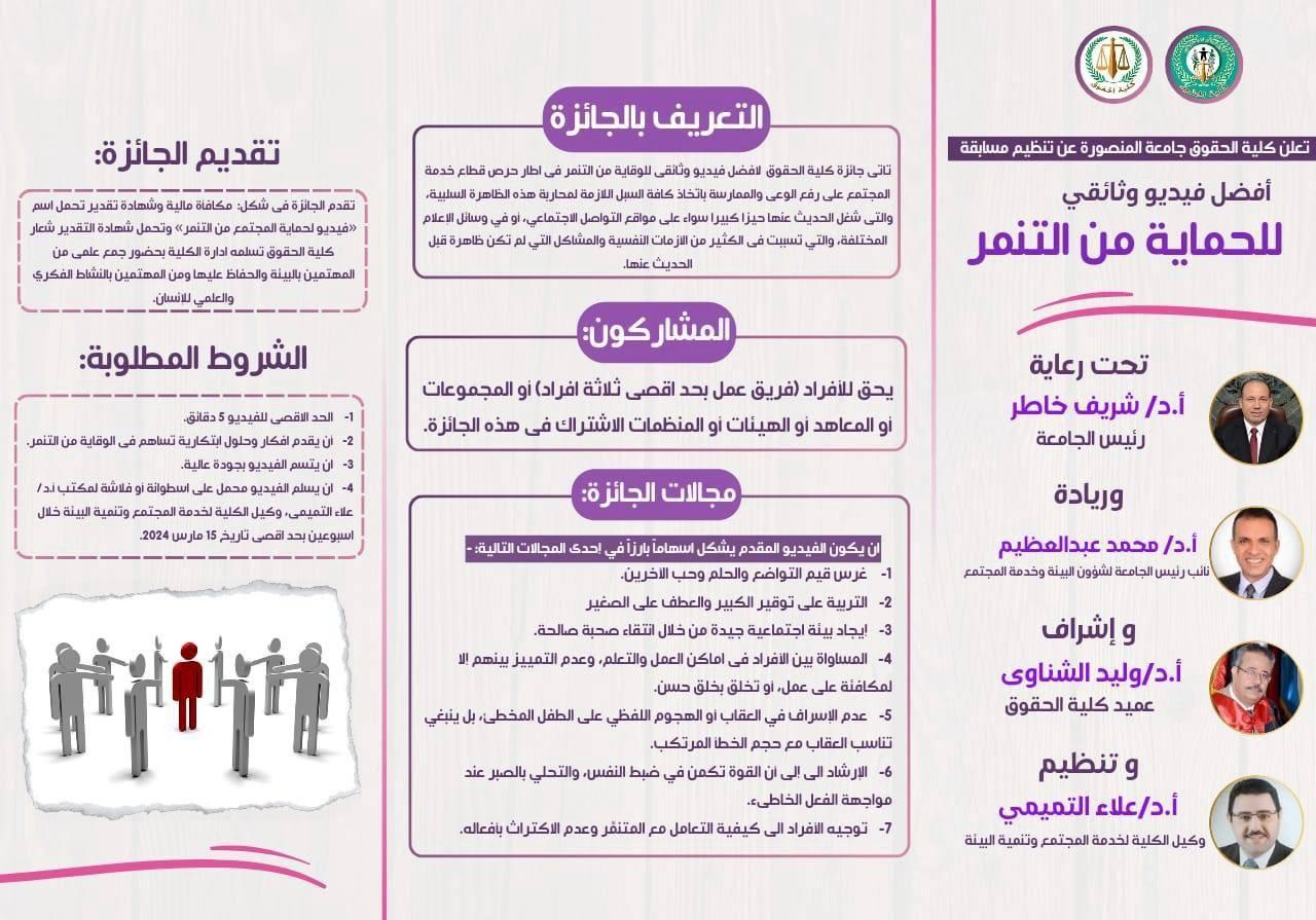 أعلنت كلية الحقوق جامعة المنصورة عن تنظيم مسابقة تحت عنوان "افضل فيديو وثائقى للحماية من التنمر" وذلك تحت رعاية الدكتور شريف يوسف خاطر رئيس الجامعة وريادة الدكتور محمد عبد العظيم نائب رئيس الجامعة لشؤون البيئة وخدمة المجتمع وإشراف الدكتور وليد الشناوي عميد كلية الحقوق وتنظيم الدكتور علاء التميمي وكيل الكلية لخدمة المجتمع وتنمية البيئة.