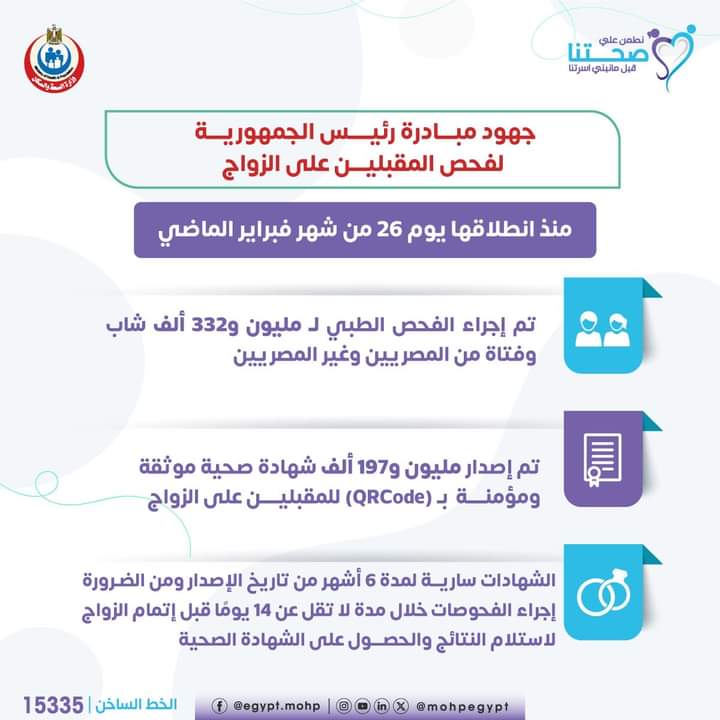 وأكدت وزارة الصحة والسكان، حرصها على إمداد المواطنين بالمعلومات، والرد على الاستفسارات الخاصة بمبادرة فحص المقبلين على الزواج من خلال الخط الساخن 15335، أو زيارة الموقع الإلكتروني: