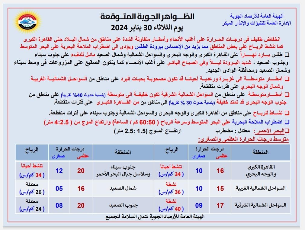 وحذرت من هطول أمطار متوسطة إلى غزيرة ورعدية قد تكون مصحوبة بحبات البرد على مناطق من (مطروح- الإسكندرية- البحيرة- كفر الشيخ -الدقهلية)، ومتوسطة على مناطق من ( دمياط- بورسعيد- شمال سيناء)، وخفيفة إلى متوسطة على مناطق من ( الغربية- الشرقية -المنوفية ) قد تمتد خفيفة إلى مناطق من ( القاهرة- الجيزة- القليوبية).