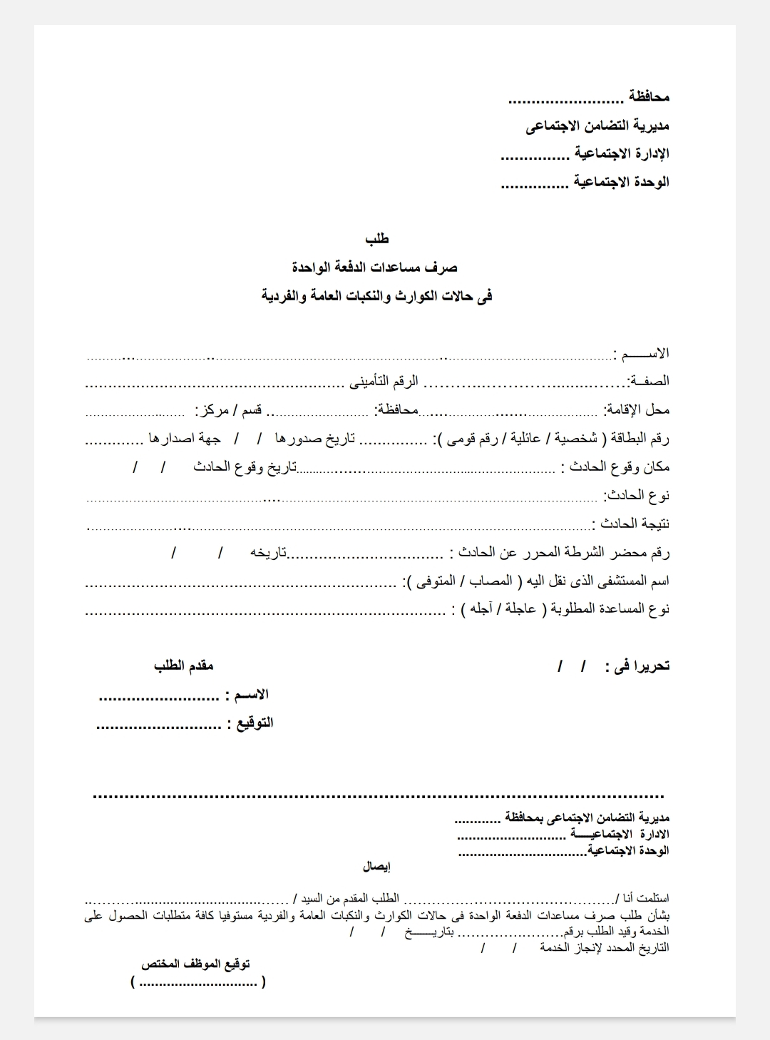 الأوراق المطلوبة لـ طلب صرف مساعدات الدفعة الواحدة فى حالات الكوارث والنكبات العامة الفردية بالمنيا