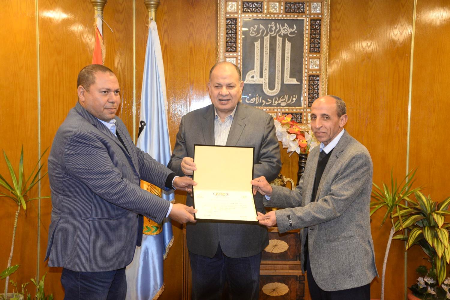 وكرم المحافظ بمكتبه بديوان عام المحافظة الدكتور نادر رشاد نصار المشرف على القوافل والدكتور صلاح علي قطب وكيل الوزارة ومدير مديرية الطب البيطرى بالمحافظة وفريق معهد بحوث التناسليات المشارك في القوافل البيطرية، كما تم إهداء درع المعهد للوزير المحافظ تقديرًا لدعمه المستمر لتنفيذ القوافل البيطرية بقرى المحافظة.
