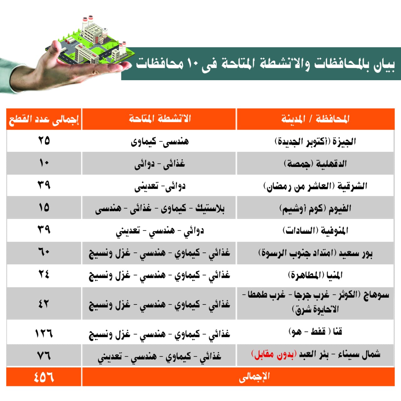 وأشارت إلى أن هذا الطرح يشمل قطع أراضي مرفقة بإجمالي 456 قطعة جديدة على مساحة اجمالية تتخطى المليون م2 موزعة على 10 محافظات على مستوى الجمهورية بأنشطة صناعية متنوعة بمساحات تتراوح من 200 م2 الى 10 الاف م2.