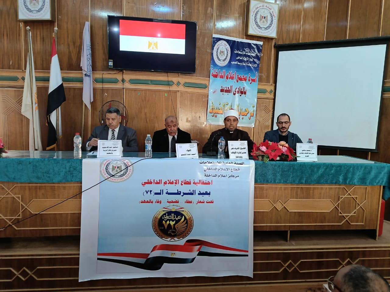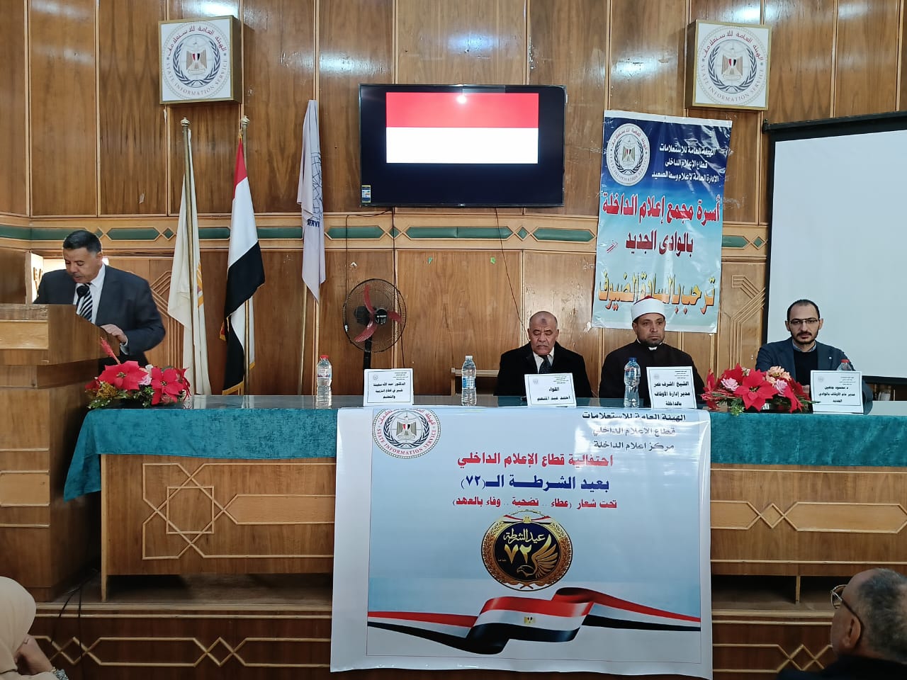 بدأت الاحتفالية بدأت بالسلام الوطني لجمهورية مصر العربية، وافتتح الاحتفالية مدير مركز إعلام الداخلة محسن محمد مرحبا بالحضور، مشيرًا إلى أن الاحتفال بعيد الشرطة المصرية يواكب ذكرى هامة وغالبة على نفوسنا جميعا تجسدت في موقعة الإسماعيلية عام ١٩٥٢ التي قدم فيها رجال الشرطة أسمى آيات التضحية دفاعا عن تراب الوطن، مؤكدا على أن هذا الاحتفال يذكرنا كذلك بدور شهداء قوات الشرطة الذين ضحوا بأرواحهم في هذه المعركة وخلال مسيرة قوات الشرطة الحافلة في الدفاع عن الوطن ومكافحة الإرهاب.