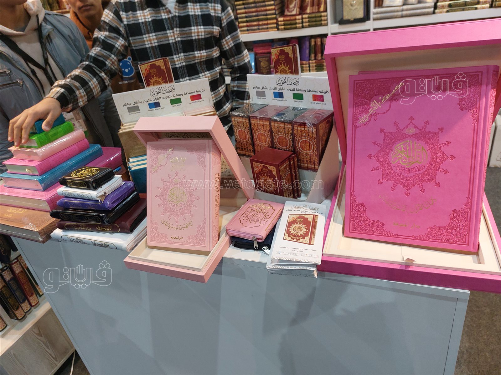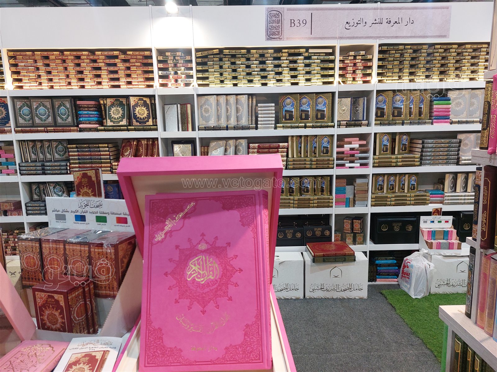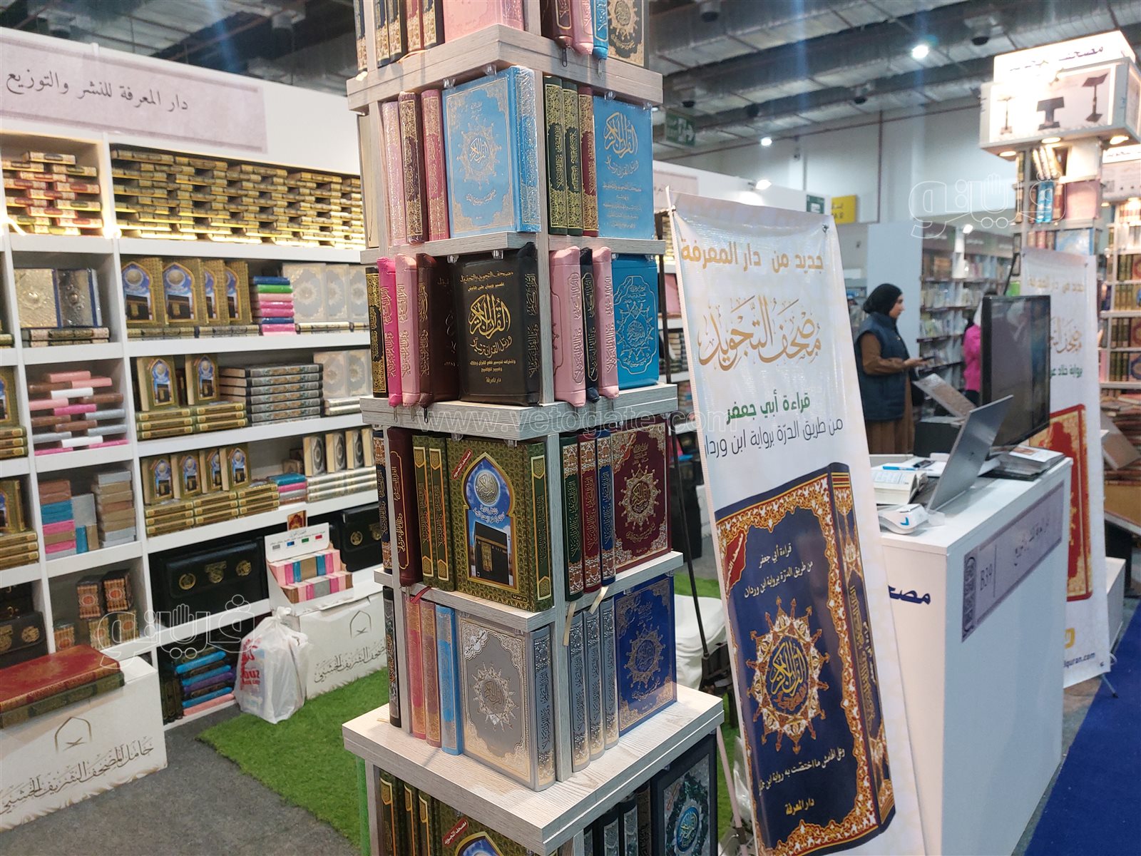 بالقرب من جناح الأزهر في قاعة 4 بمعرض الكتاب ستجد جناحا يتزين بأحجام وألوان وتصميمات مختلفة للمصاحف وهو جناح دار المعرفة للنشر والتوزيع.