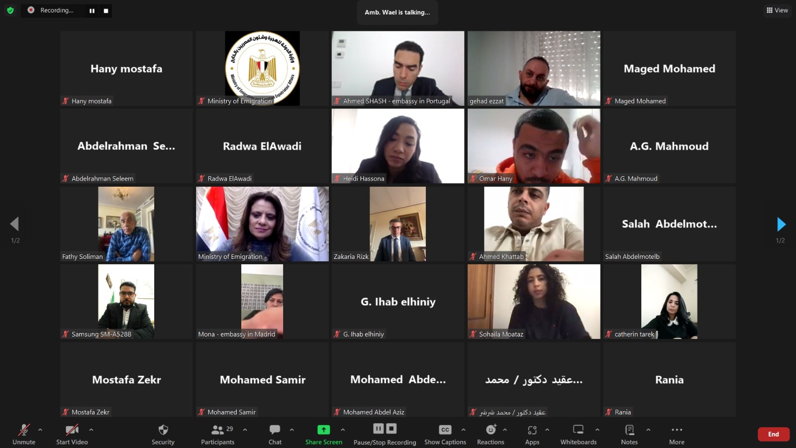 من جانبها، رحبت السفيرة سها جندي وزيرة الهجرة، بجميع أعضاء ورموز الجالية المصرية في كلا من أسبانيا والبرتغال، مشيرة في بداية حديثها إلى استراتيجية وزارة الهجرة التي تستهدف التواصل مع كافة شرائح المصريين بالخارج، وفي إطارها يتم التواصل المباشر مع الجاليات المصرية بالخارج، والتي تسعى من خلالها لحل أي مشكلات أو تحديات تواجه المصريين بالخارج حيث تمثل مبادرة "ساعة مع الوزيرة" واحدة من ركائز هذه الاستراتيجية، وتم تنفيذ نحو ٦٥ اجتماعا افتراضيا في إطار المبادرة، والهدف يبقى هو التواصل المستمر والفاعل والوصول لاكبر عدد من الجاليات في كل دول العالم.