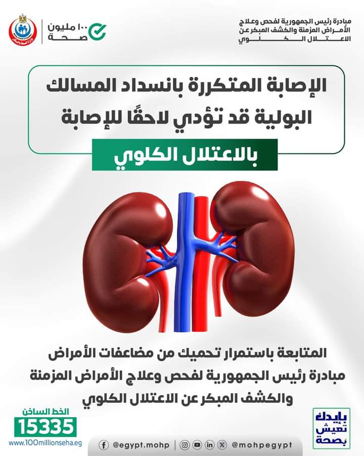 حذرت وزارة الصحة من الإصابة المتكررة بانسداد المسالك البولية حيث تؤدي إلى الإصابة بالاعتلال الكلوي.