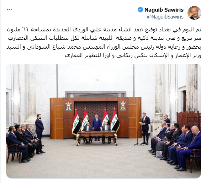 وقال المهندس نجيب ساويرس، عن توقيع عقد أكبر مدينة سكنية في العراق: "تم اليوم في بغداد توقيع عقد إنشاء مدينة علي الوردي الجديدة بمساحة ٦١ مليون متر مربع وهي مدينة ذكية وصديقة للبيئة شاملة لكل متطلبات السكن الحضاري بحضور ورعاية دولة رئيس مجلس الوزراء المهندس محمد شياع السودانى ووزير الإعمار والإسكان بنكين ريكانى وأورا للتطوير العقاري"