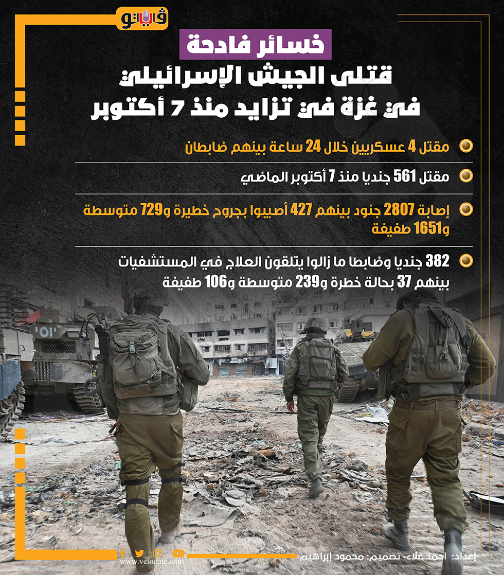 خسائر فادحة، قتلى الجيش الإسرائيلي في غزة في تزايد منذ 7 أكتوبر (إنفوجراف) الخميس 01/فبراير/2024 - 01:38 م 2/1/2024 1:38:27 PM قتلى الجيش الإسرائيلي في غزة، فيتو احمد علاء شارك طباعة 18 حجم الخط شارك طباعة غزة ”طوفان الأقصى قتلى الجيش الإسرائيلي في غزة مصابي الجيش الإسرائيلي العدوان الاسرائيلي علي غزة