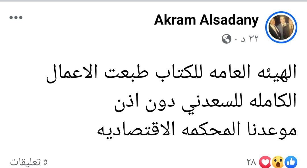 ومع التداول الكبير من قبل الجمهور.. أصدر الكاتب الصحفي أكرم السعدني تعليقًا مفاجئًا على تلك الأعمال الكاملة قائلًا: الهيئة العامة للكتاب طبعت الأعمال الكاملة للسعدني دون إذن .. موعدنا المحكمة الاقتصادية".