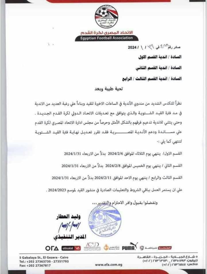 وقرر اتحاد الكرة مد الميركاتو الشتوي حتى يوم 6 فبراير الجاري للقسم الأول.