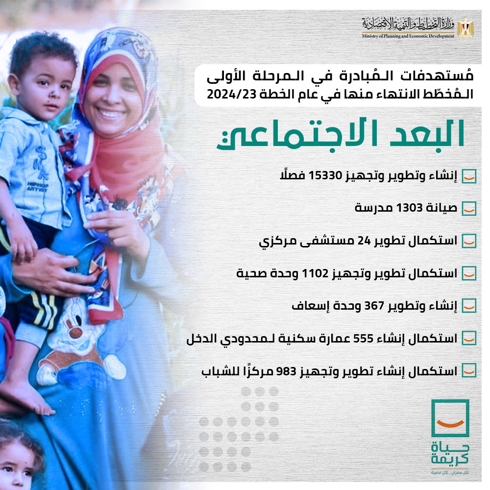 وأشار تقرير وزارة التخطيط والتنمية الاقتصادية إلى مُستهدفات الـمُبادرة في الـمرحلة الأولى الـمُخطّط نهوها في عام الخطة 23/2024، ففيما يخص البعد الاجتماعي تستهدف الخطة إنشاء وتطوير وتجهيز 15330 فصلًا، صيانة 1303 مدرسة، استكمال تطوير 24 مستشفى مركزي، استكمال تطوير وتجهيز 1102 وحدة صحية، إنشاء وتطوير 367 وحدة إسعاف، استكمال إنشاء 555 عمارة سكنية لـمحدودي الدخل، إلى جانب استكمال إنشاء تطوير وتجهيز 983 مركزًا للشباب، وفيما يخص البُعد العمراني تستهدف الخطة استكمال توصيل وتطوير شبكات مياه الشرب بأطوال 8.5 ألف كم.