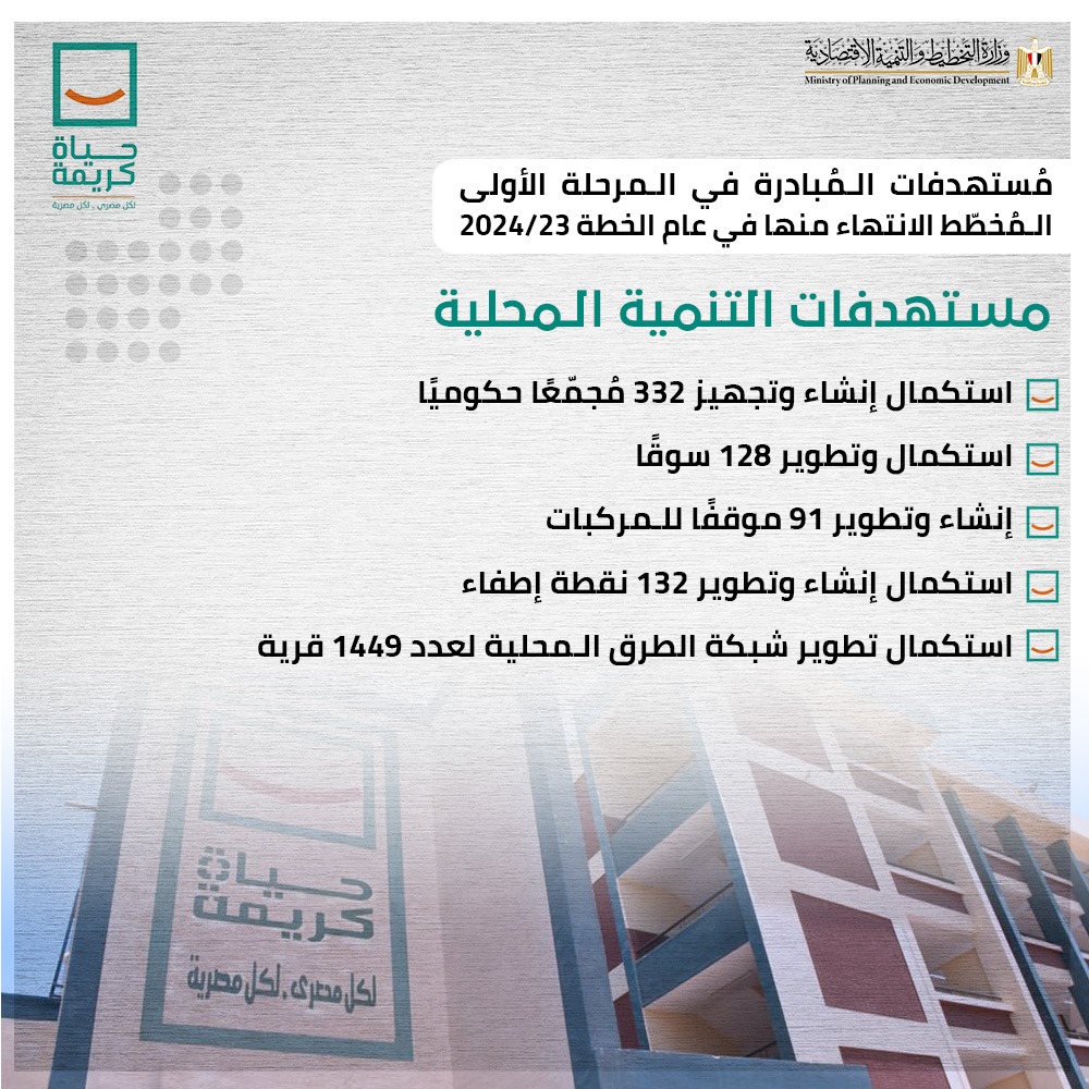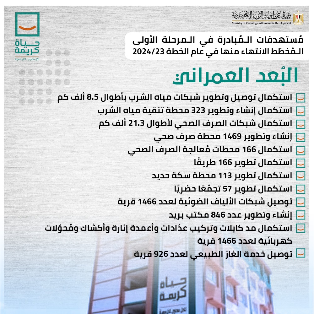 استعرضت وزارة التخطيط والتنمية الاقتصادية في تقرير صادر عنها مستهدفات المشروع القومي لتطوير الريف المصري "حياة كريمة" بخطة العام المالي الحالي 23/2024.