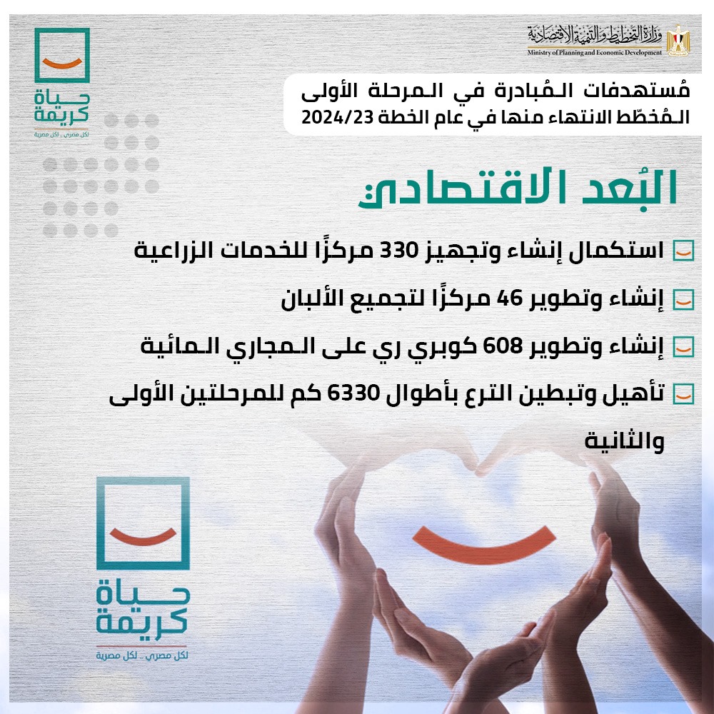وحول مستهدفات البُعد الاقتصادي أوضح التقرير أنها تتمثل في استكمال إنشاء وتجهيز 330 مركزًا للخدمات الزراعية، إنشاء وتطوير 46 مركزًا لتجميع الألبان، إنشاء وتطوير 608 كوبري ري على ا لـمجاري الـمائية، تأهيل وتبطين الترع بأطوال 6330 كم للمرحلتين الأولى والثانية، وفيما يتعلق بمستهدفات التنمية الـمحلية فإنها تتمثل في استكمال إنشاء وتجهيز 332 مُجمّعًا حكوميًا، استكمال وتطوير 128 سوقًا، إنشاء وتطوير 91 موقفًا للـمركبات، استكمال إنشاء وتطوير 132 نقطة إطفاء، استكمال تطوير شبكة الطرق الـمحلية ل 1449 قرية.