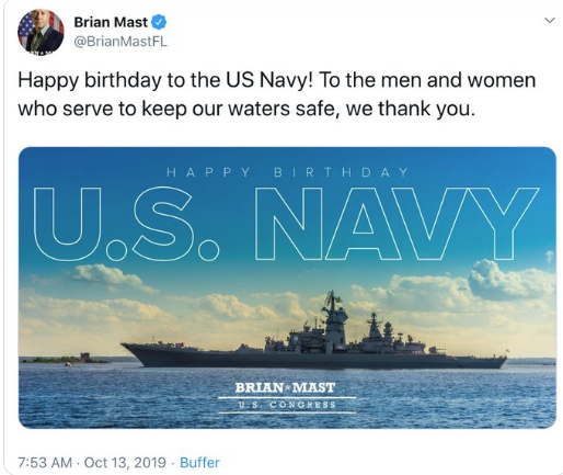 ووجه براين في تغريدته، التحية للبحرية الأمريكية، مستخدمًا صورة الطراد "بطرس الأكبر" الروسي، ليفاجأ بموجة من الاعتراض، حيث علق الصحفي السياسي ديف براون، على التغريدة، قائلًا: الصورة تمثل الطراد الروسي "بطرس الأكبر".