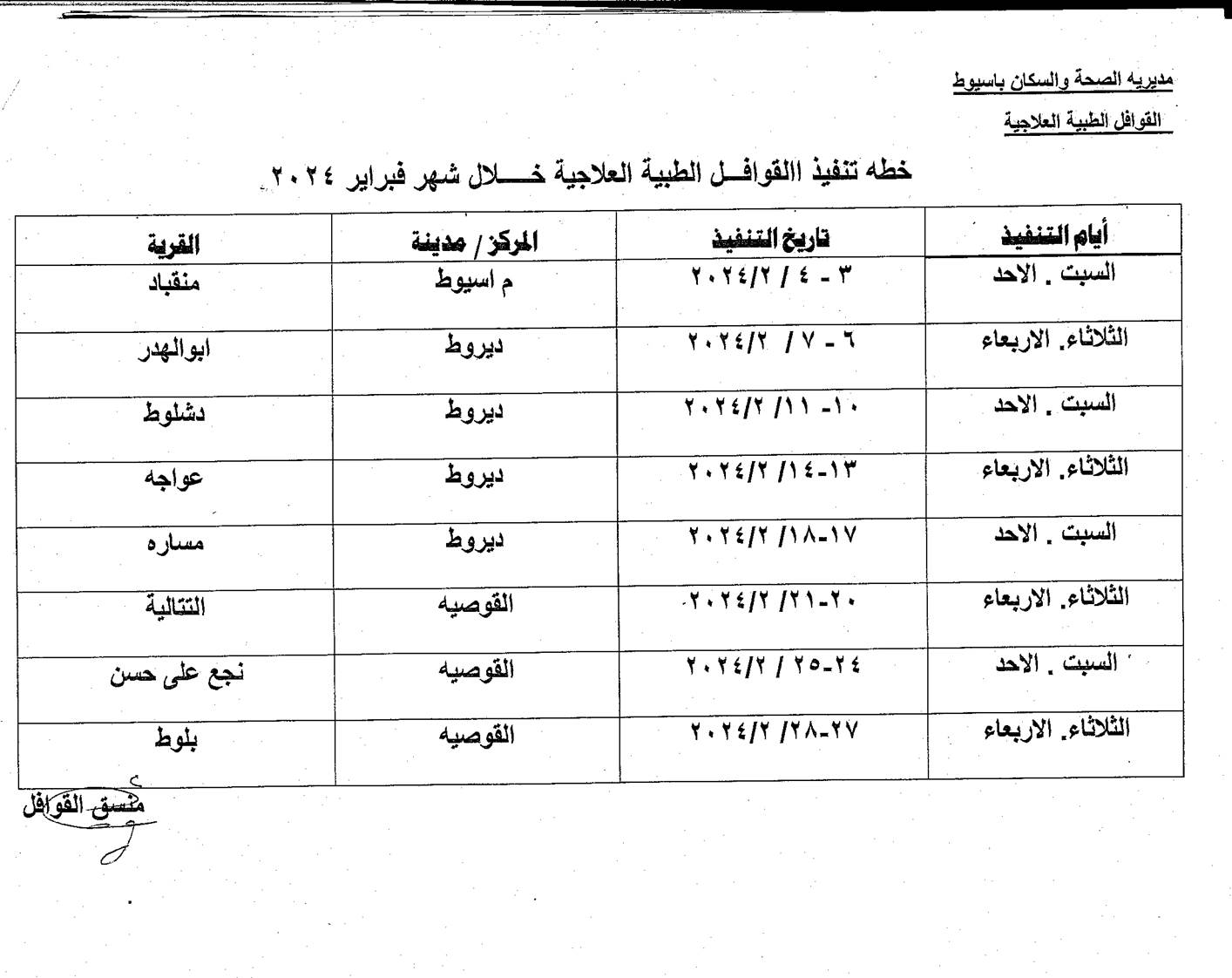 وأشار محافظ أسيوط إلى أن القوافل يتم تنفيذها بواقع يومين بكل قرية حيث تبدأ يومي السبت والأحد 3 و4 فبراير بقرية منقباد بمركز أسيوط تنتقل بعدها لمركز ديروط يومي الثلاثاء والأربعاء 6 و7 فبراير بقرية أبو الهدر ثم يومي السبت والأحد 10 و11 فبراير بقرية دشلوط ثم يومي الثلاثاء والأربعاء 13 و14 فبراير بقرية عواجه وتختتم أعمالها بمركز ديروط يومي السبت والأحد 17 و18 فبراير بقرية مساره بعدها تتوجه القافلة لمركز القوصية وتبدأ أعمالها يومي الثلاثاء والأربعاء 20 و21 فبراير بقرية التتالية ثم يومي السبت والأحد 24 و25 فبراير بقرية نجع علي حسن وتختتم القافلة أعمالها لشهر فبراير بتقديم خدماتها يومي الثلاثاء والأربعاء 27 و28 فبراير بقرية بلوط بمركز القوصية.