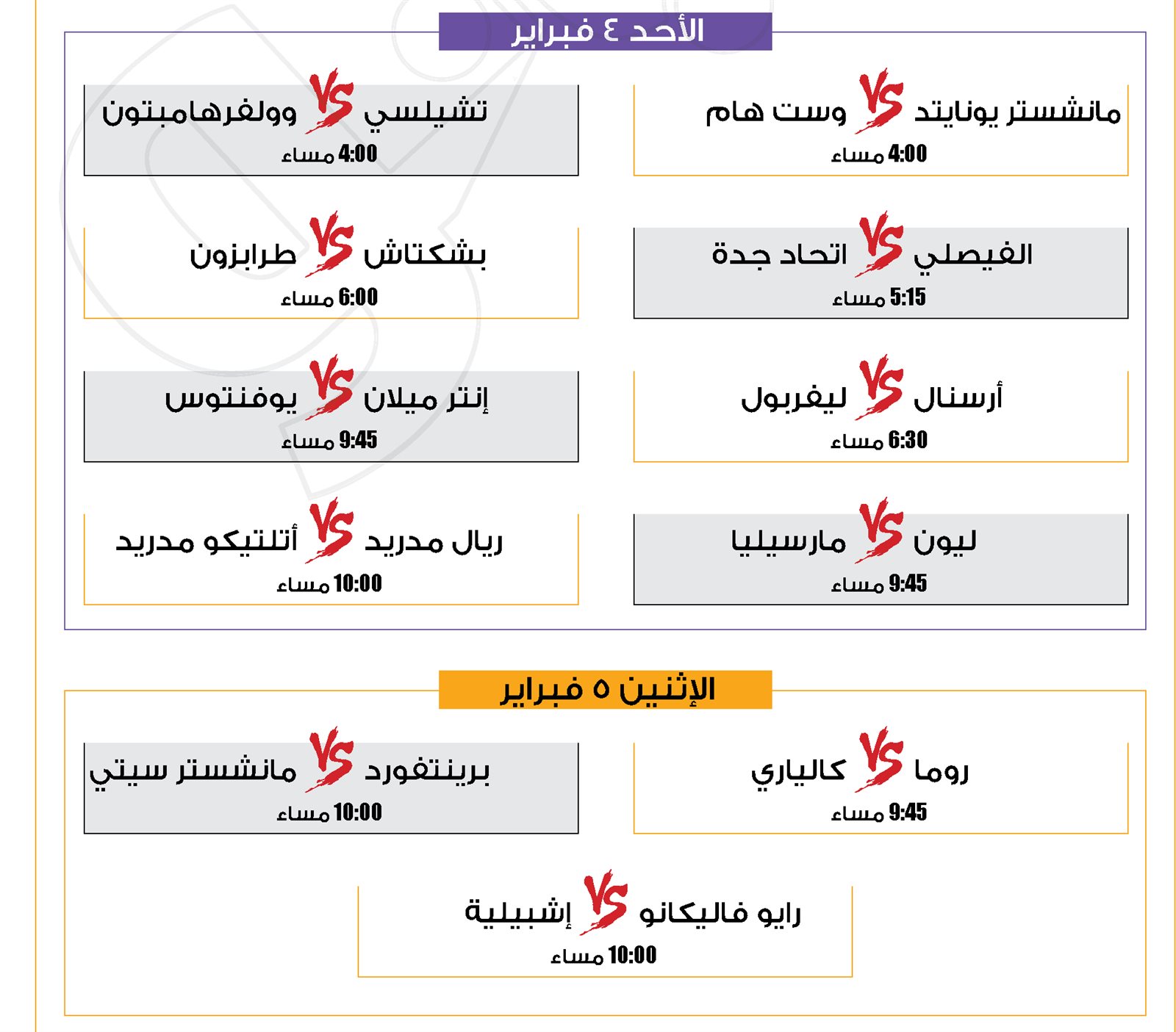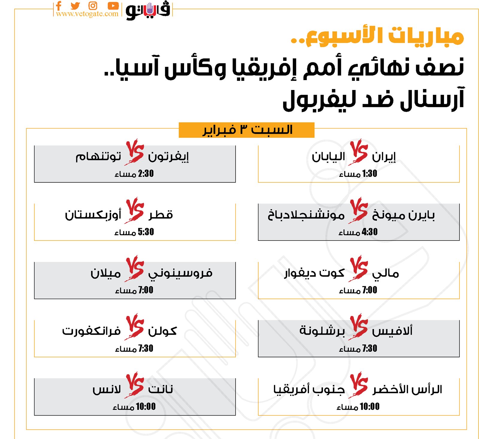مباريات الأسبوع.. نصف نهائي أمم إفريقيا وكأس آسيا.. آرسنال ضد ليفربول (إنفوجراف) الجمعة 02/فبراير/2024 - 09:00 م 2/2/2024 9:00:50 PM منتخب نيجيريا، فيتو محمد سيد شارك طباعة 18 حجم الخط شارك طباعة كأس آسيا كأس أمم أفريقيا ليفربول أرسنال ريال مدريد