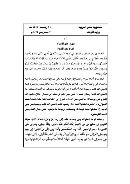 حددت وزارة الأوقاف موضوع خطبة اليوم الجمعة تحت عنوان “من دروس الإسراء الفرج بعد الشدة” وذلك بالتزامن مع حلول ذكرى رحلة الإسراء والمعراج.