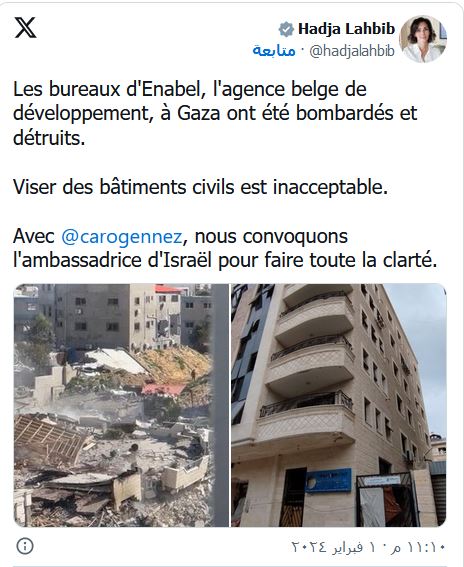 وقالت الوزيرة عبر حسابها في منصة "إكس": "تم قصف وتدمير مكاتب وكالة التنمية البلجيكية (Enabel) في غزة. استهداف المباني المدنية أمر غير مقبول".