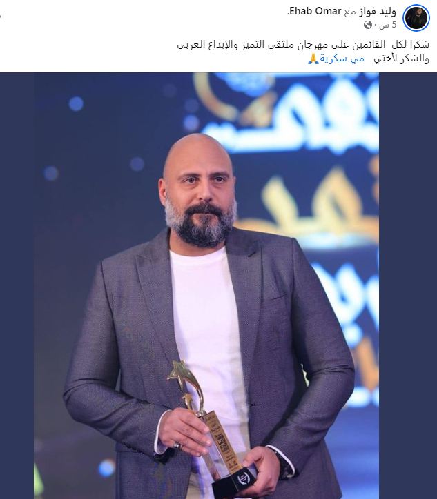ونشر الفنان وليد فواز، عبر حسابه الشخصي على موقع تبادل الصور والفيديوهات الفيس بوك، صورة من تكريمه ملتقى التمير والإبداع الفني في دورته الثانية.