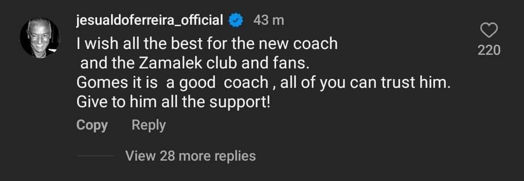 وعلق فيريرا على منشور إعلان الزمالك التعاقد مع جوزيه جوميز عبر موقع التواصل الاجتماعي انستجرام، حيث كتب: "أتمنى التوفيق للمدرب الجديد ولنادي الزمالك وجمهوره، جوميز مدرب جيد ثقوا به وادعموه.
