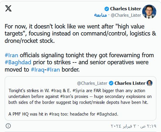 كذلك، اعتبر الباحث الأمريكي شارلز ليستر، مدير برامج مكافحة الإرهاب والتطرف في معهد الشرق الأوسط، أن الضربات لم تطل "أهدافًا ذات قيمة عالية"، بل ركزت على مواقع لوجيستية للميليشيات ومخازن للصواريخ والدرون.