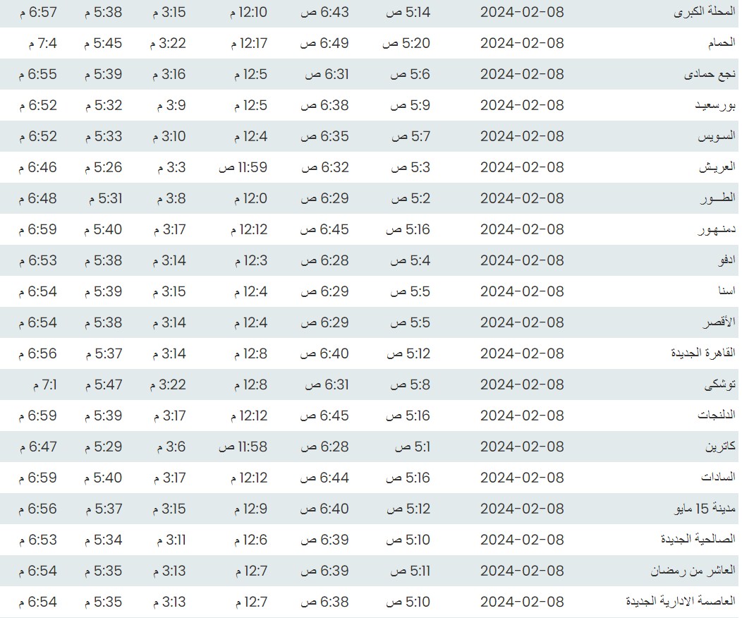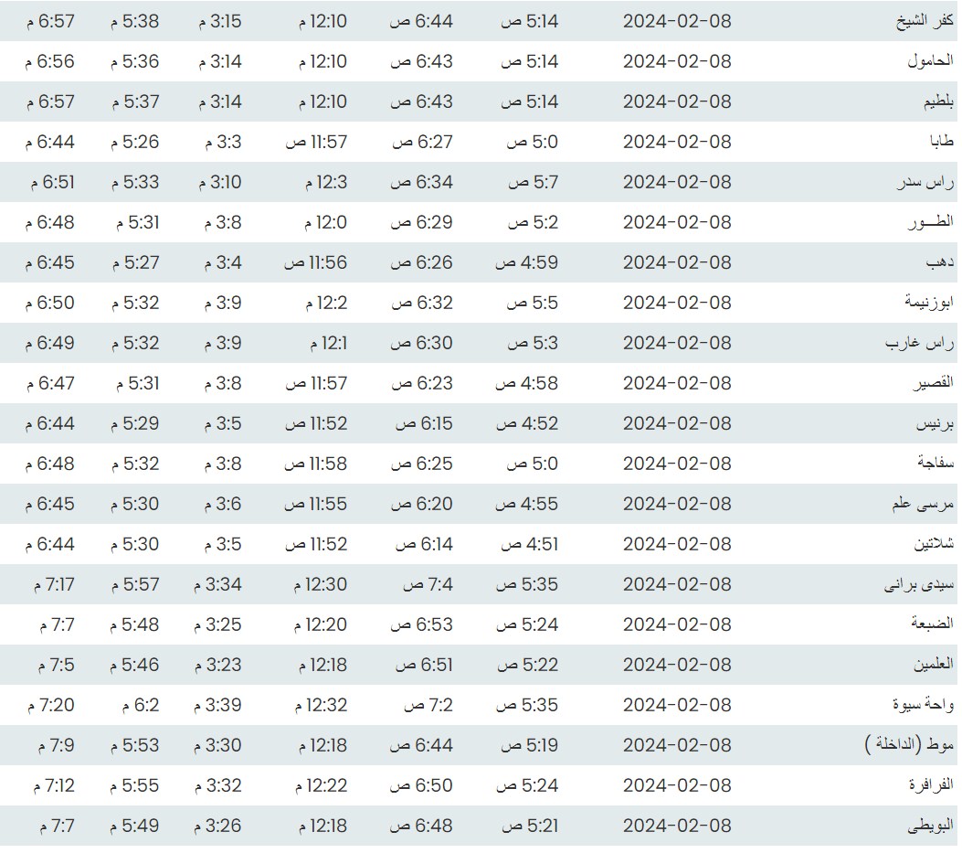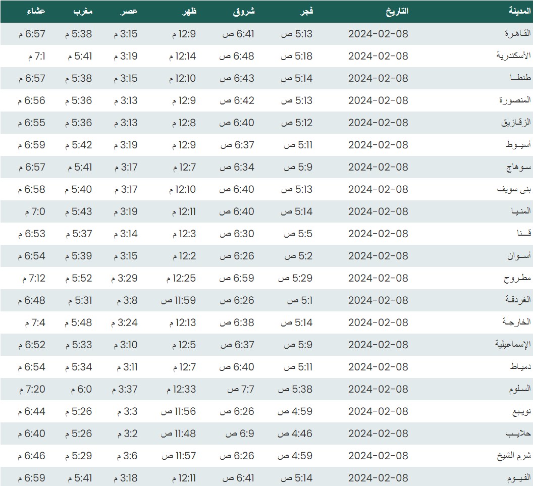 وفيما يلي مواقيت الصلاة، لعدد من مدن ومحافظات الجمهورية من واقع بيانات الهيئة العامة للمساحة