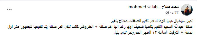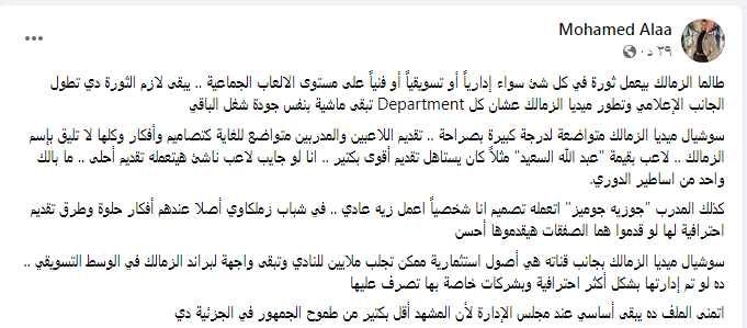 وانتقد عدد كبير من جماهير الزمالك طريقة السوشيال ميديا الخاصة بالنادي فى الإعلان عن المدير الفني والصفقات وتغطية الموقع الرسمي للإعلان عن الصفقات وعدم نشر أخبار بإستمرار عن الصفقات وأرقامهم مع أنديتهم السابقة وإجراء حوارات لهم وظهور في بث مباشر للجماهير.