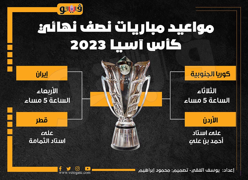 مواعيد مباريات نصف نهائي كأس آسيا 2023 (إنفوجراف) السبت 03/فبراير/2024 - 10:13 م 2/3/2024 10:13:13 PM كأس آسيا، فيتو يوسف الفقي شارك طباعة 18 حجم الخط شارك طباعة كأس آسيا نصف نهائي كأس اسيا قطر ضد إيران إيران ضد قطر كوريا الجنوبية ضد الأردن