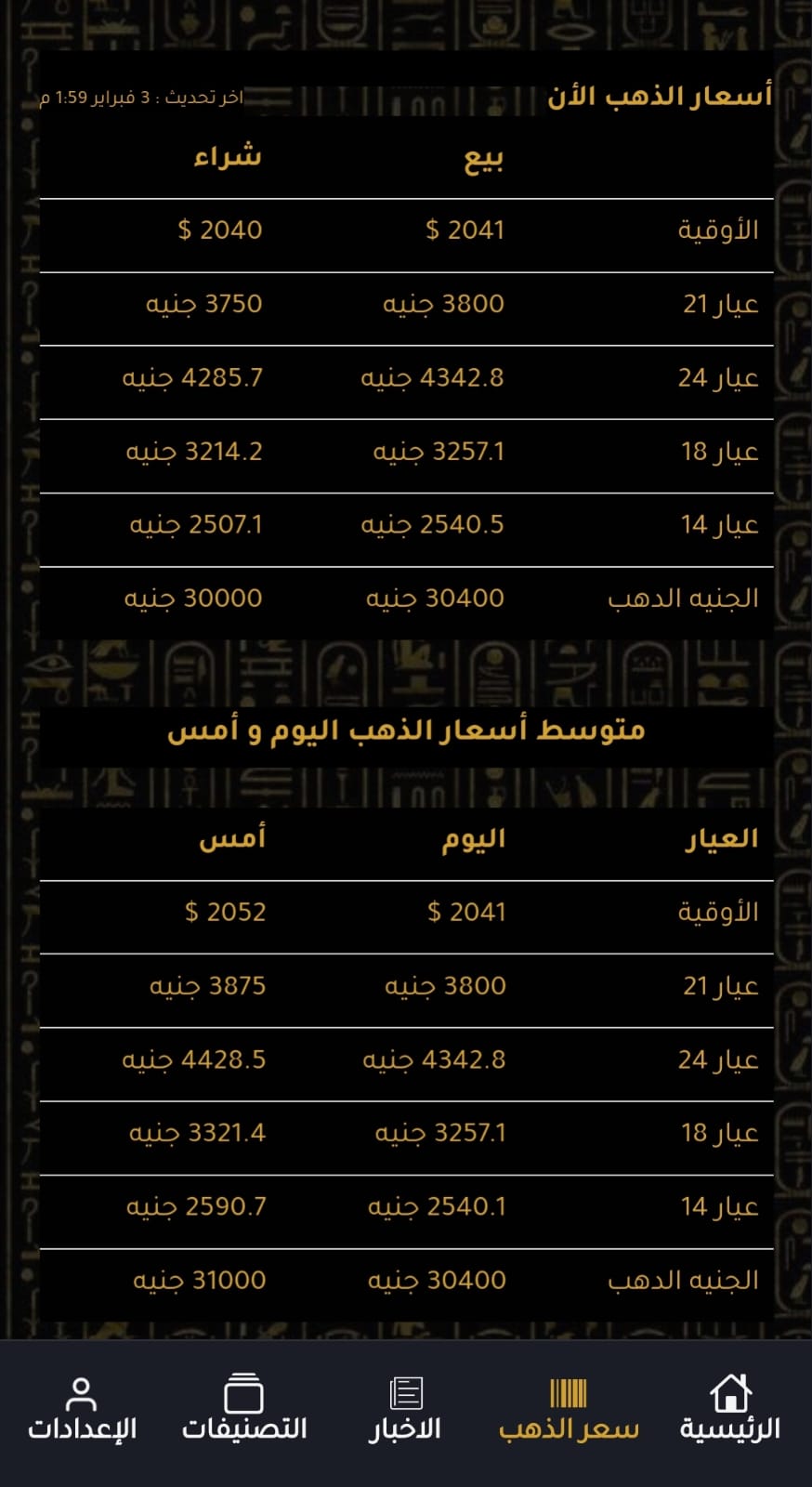 آخر تحديث لسعر الذهب من شعبة الذهب والمجوهرات بالاتحاد العام للغرف التجارية.