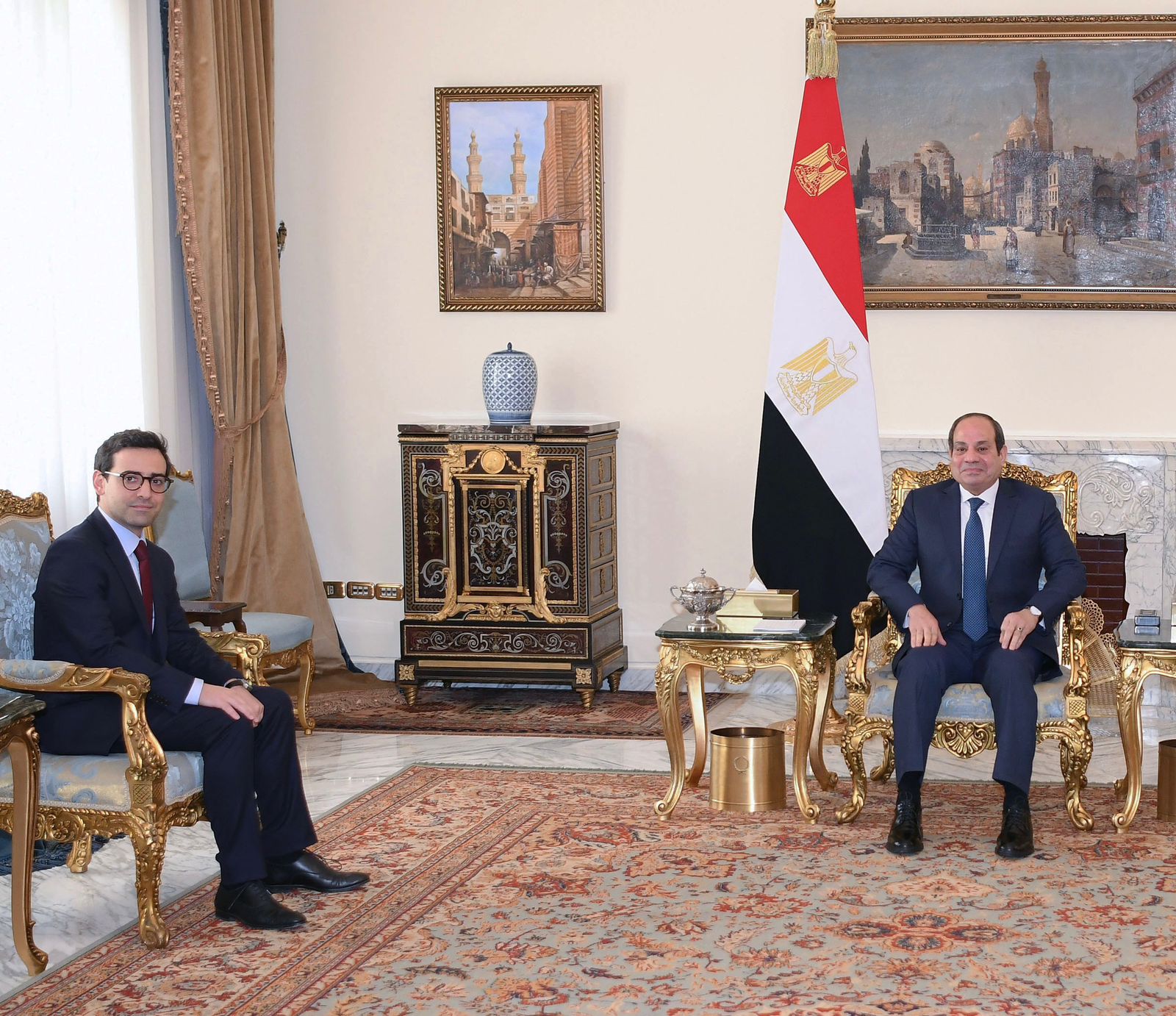 وصرح المتحدث الرسمي باسم رئاسة الجمهورية المستشار الدكتور أحمد فهمي أن اللقاء تناول العلاقات الثنائية بين البلدين، ونقل الوزير الفرنسي تحيات الرئيس "إيمانويل ماكرون" إلى الرئيس