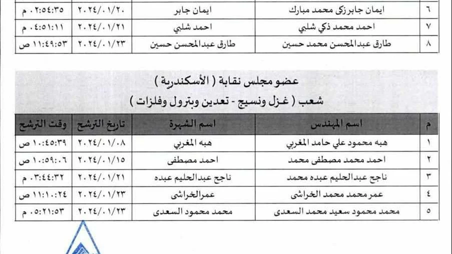 أعلنت اللجنة المشرفة على انتخابات التجديد النصفى لمجلس نقابة المهندسين الفرعية بالإسكندرية ومجالس الشعب الأسماء النهائية للمرشحين للانتخابات المقرر عقدها يوم 23 فبراير الجاري على 7 مقاعد.