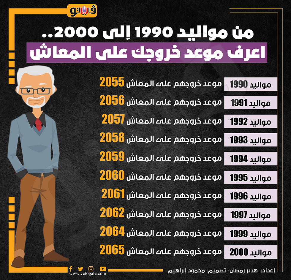 من مواليد 1990 إلى 2000.. اعرف موعد خروجك على المعاش (إنفوجراف) الثلاثاء 06/فبراير/2024 - 03:00 م 2/6/2024 3:00:32 PM التأمينات الاجتماعية، فيتو هدير رمضان شارك طباعة 18 حجم الخط شارك طباعة وزيرة التضامن الاجتماعي أموال هيئة التأمينات رفع سن المعاش سن المعاش مد سن المعاش