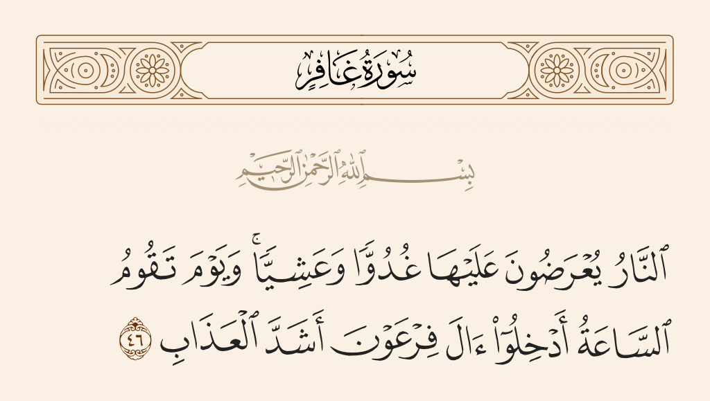 وأضاف الشيخ الشعراوي: إذن فلا زمن للإنسان إلا الحياة الدنيا والموت والآخرة، ففي قوله تعالى (ويوم تقوم الساعة) أي زمن الآخرة، وقوله (يُعرضون) فلم يبقَ لها إلا زمنين اثنين، وهما الدنيا والموت، وهم لم يُعرضوا على النار في الحياة الدنيا، إذن العرض في زمن الموت فقط.