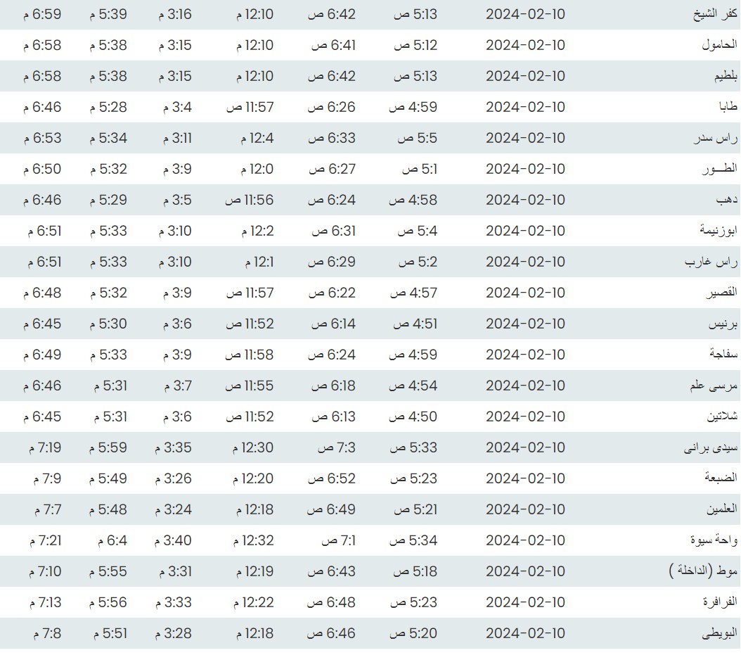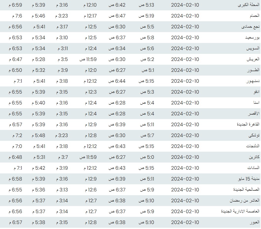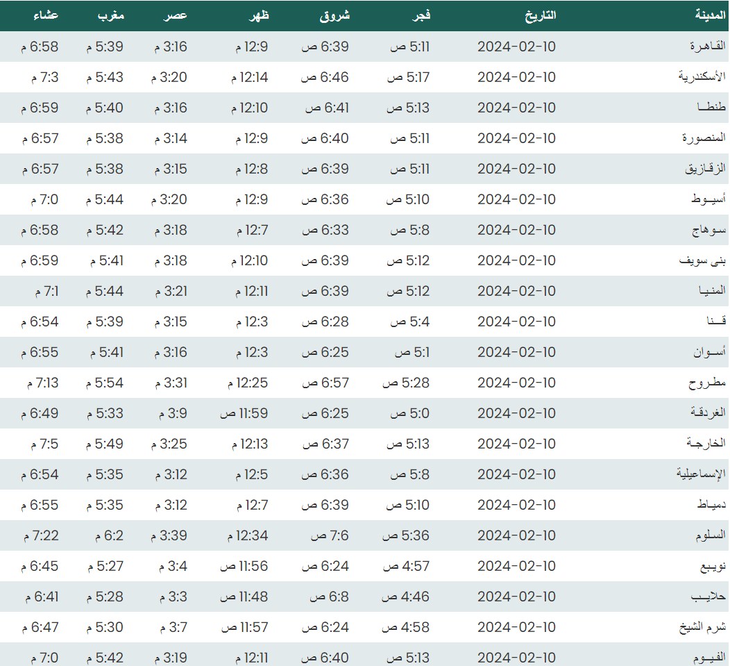 وفيما يلي مواقيت الصلاة، لعدد من مدن ومحافظات الجمهورية من واقع بيانات الهيئة العامة للمساحة