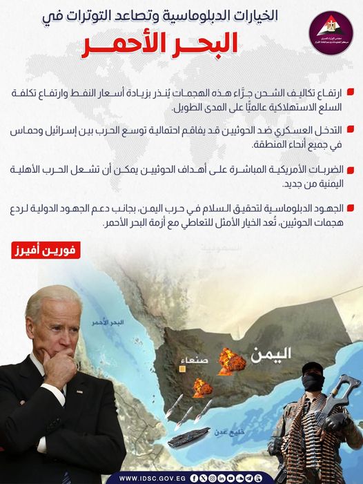 نشرت الصفحة الرسمية لمركز المعلومات ودعم اتخاذ القرار بمجلس الوزراء على موقع التواصل الاجتماعي فيسبوك انفوجراف جديدا تحت عنوان (الخيارات الدبلوماسية وتصاعد التواترات في البحر الأحمر)