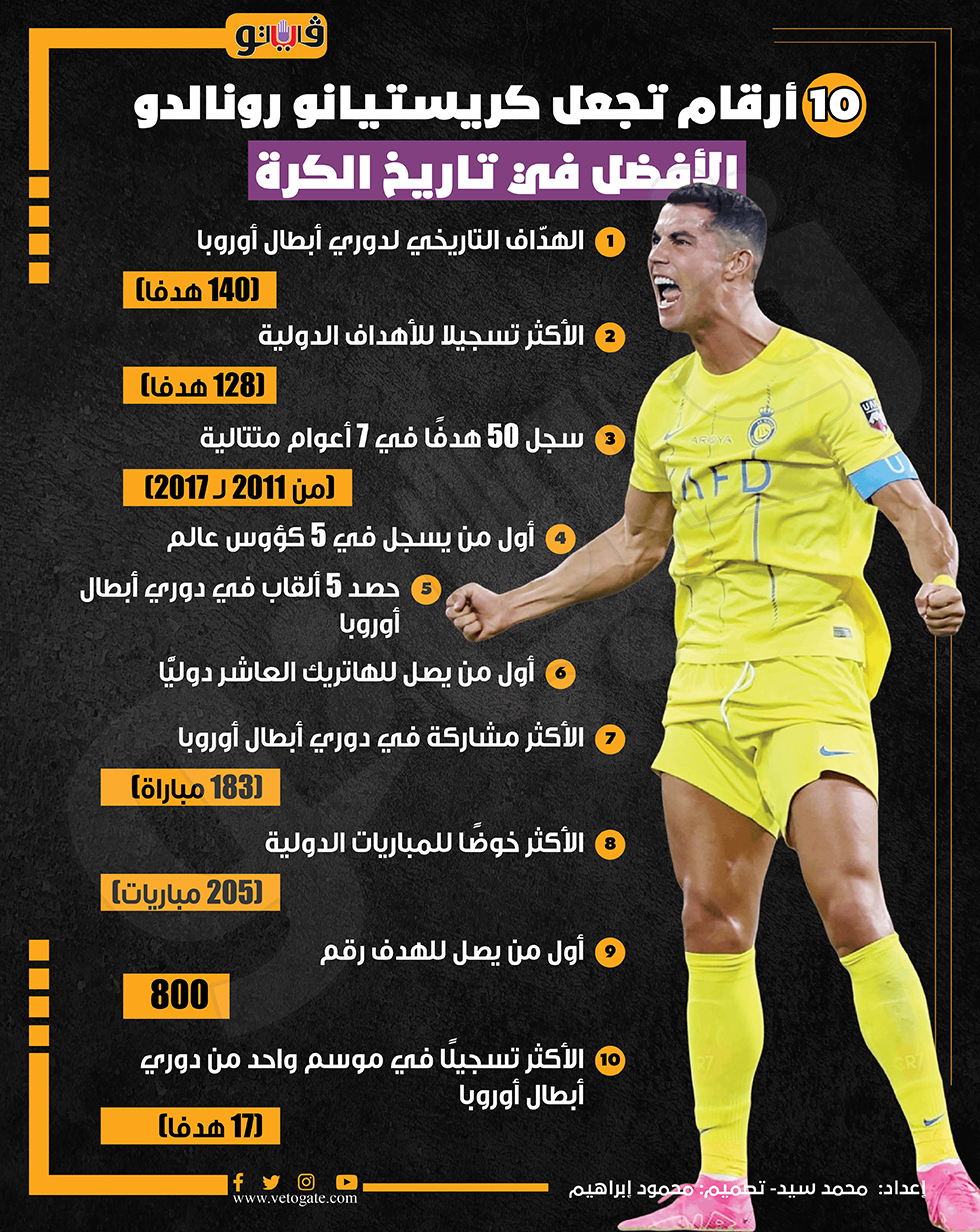 10 أرقام تجعل كريستيانو رونالدو الأفضل في تاريخ الكرة (إنفوجراف) الإثنين 05/فبراير/2024 - 05:30 م 2/5/2024 5:30:43 PM كريستيانو رونالدو، فيتو محمد سيد شارك طباعة 18 حجم الخط شارك طباعة كريستيانو رونالدو رونالدو دوري ابطال اوروبا النصر السعودي