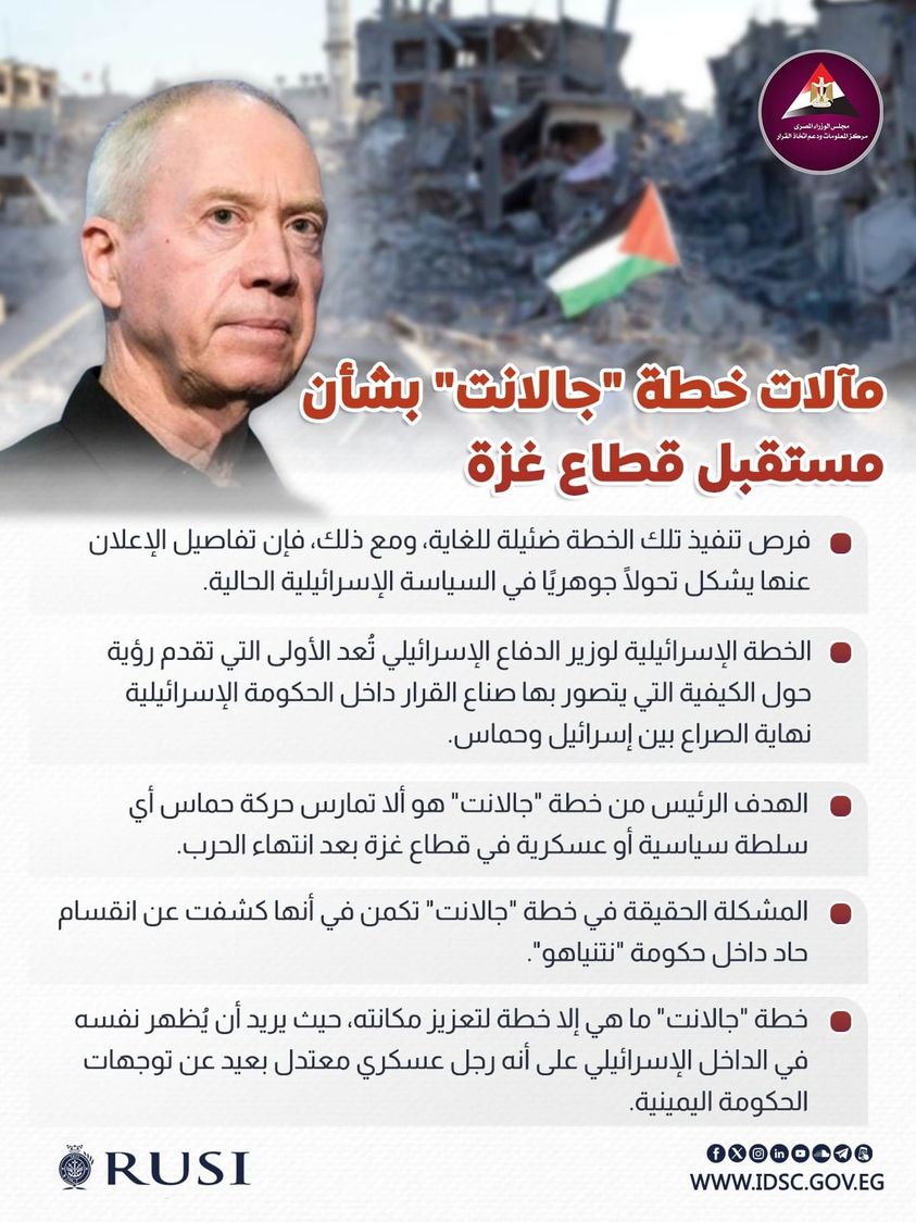 نشرت الصفحة الرسمية لمركز المعلومات ودعم اتخاذ القرار بمجلس الوزراء على موقع التواصل الاجتماعي فيسبوك انفوجرافا جديدا تحت عنوان (مآلات خطة "جالانت"بشأن مستقل قطاع غزة)