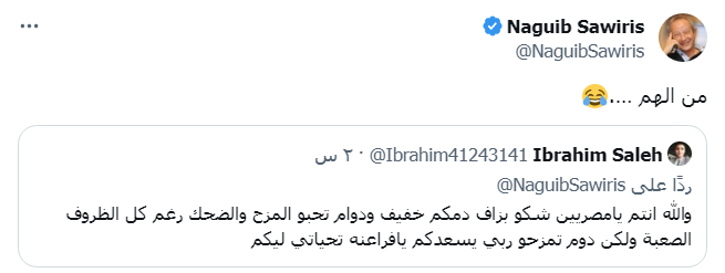 جاء رد المهندس نجيب ساويرس تعليقًا على أحد متابعيه من التونسيين، حيث قال: "والله انتم يامصريين شكو بزاف دمكم خفيف ودوام تحبو المزح والضحك رغم كل الظروف الصعبة ولكن دوم تمزحو ربي يسعدكم يافراعنه تحياتي ليكم"