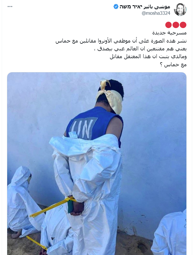 وكتب موشي يائير عن الصورة التي نشرتها سلطات الاحتلال عن موظفي الأونروا: "مسرحية جديدة، نشر هذه الصورة على أن موظفي الأونروا مقاتلين مع حماس يعني هم مقتنعين ان العالم غبي بيصدق، وما الذي يثبت أن هذا المعتقل مقاتل مع حماس؟".