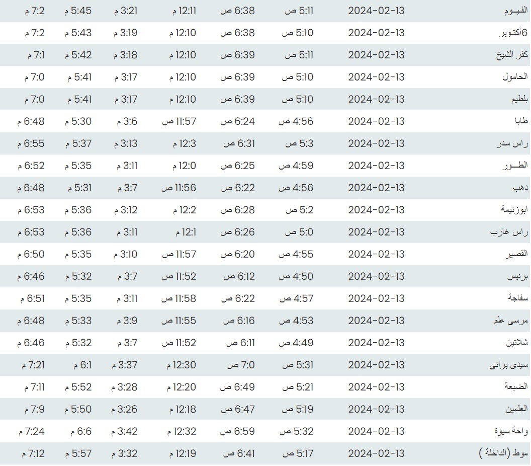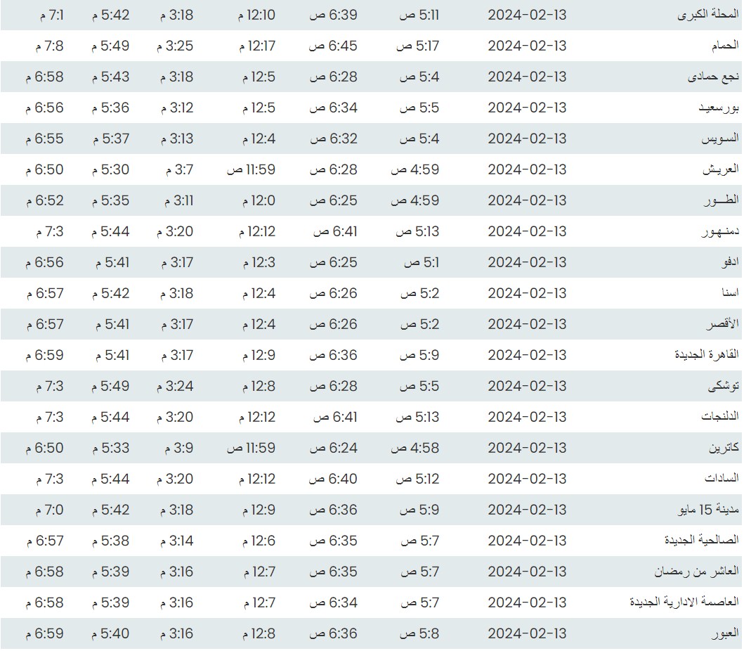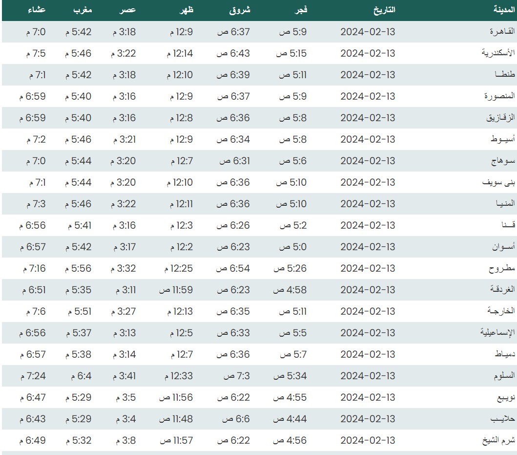 وفيما يلي مواقيت الصلاة، لعدد من مدن ومحافظات الجمهورية من واقع بيانات الهيئة العامة للمساحة