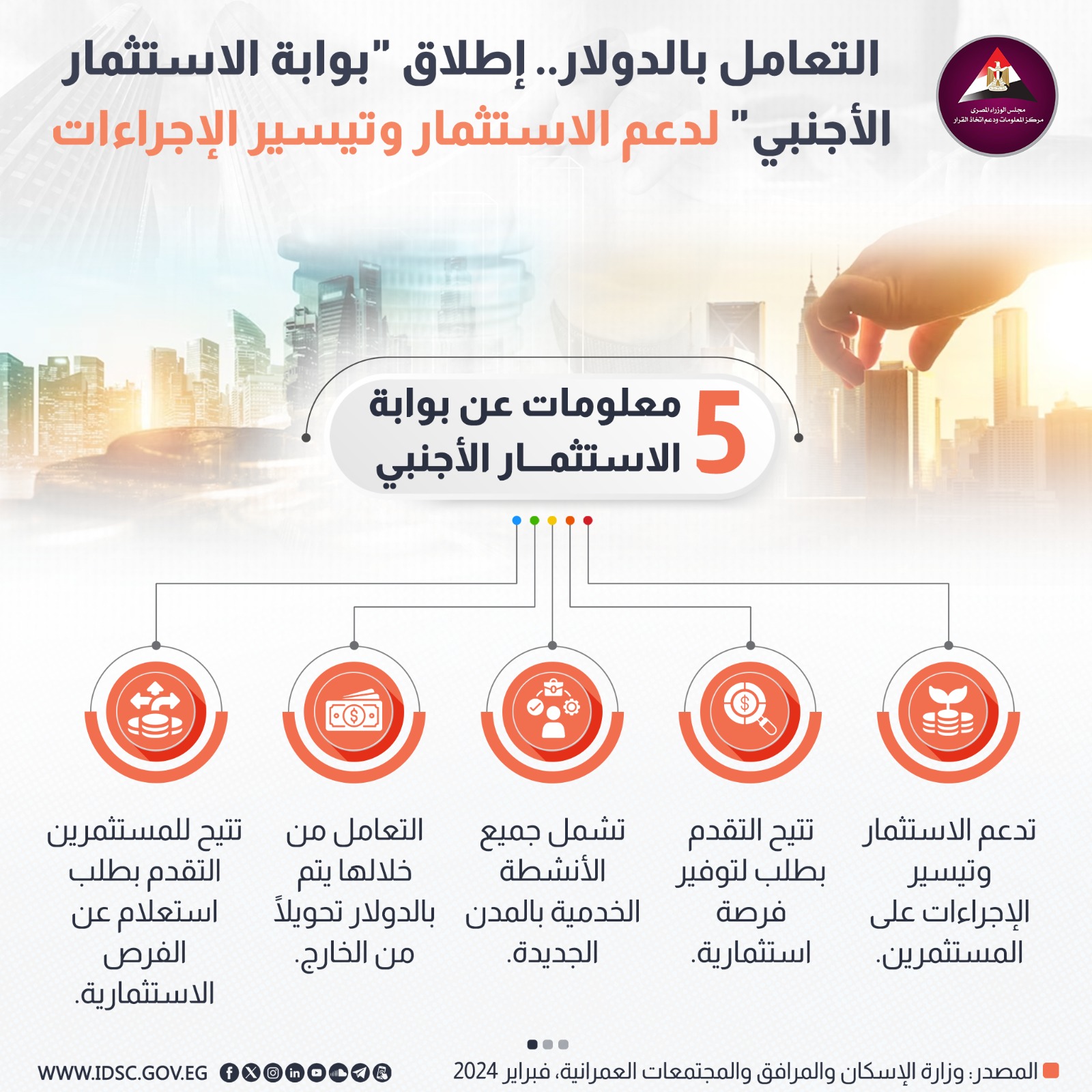 نشرت الصفحة الرسمية لمركز المعلومات ودعم اتخاذ القرار بمجلس الوزراء على موقع التواصل الاجتماعي فيسبوك انفوجراف جديدا تحت عنوان (التعامل بالدولار..إطلاق "بوابة الاستثمار الأجنبي" لدعم الاستثمار وتيسير الإجراءات).