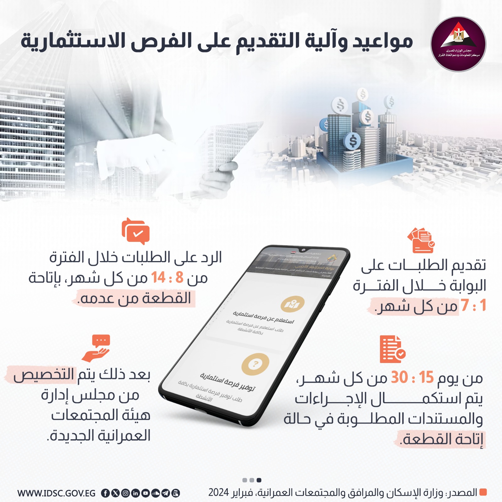 الدكتور وليد عباس، نائب رئيس هيئة المجتمعات العمرانية الجديدة لقطاع التخطيط والمشروعات - المشرف على مكتب وزير الإسكان، أشار إلى أنه بعد التسجيل، يتقدم المستثمر بطلب توفير فرصة استثمارية، فى حالة عدم معرفته بتفاصيل قطعة الأرض، أو التقدم بطلب استعلام فى حالة معرفته بتفاصيل قطعة الأرض، موضحًا أنه يتم تقديم الطلبات على البوابة خلال الفترة من يوم 1 إلى 7 من كل شهر، ويتم الرد عليها خلال الفترة من يوم 8 إلى 14 من كل شهر، بإتاحة القطعة من عدمه، ومن يوم 15 إلى 30 من كل شهر، يقوم المستثمر باستكمال الإجراءات والمستندات المطلوبة فى حالة إتاحة القطعة، وبعدها يتم التخصيص من مجلس إدارة هيئة المجتمعات العمرانية