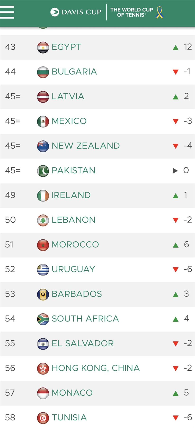 التنس، تقدم المنتخب الوطني للتنس رجال 12 مركزا في تصنيف الاتحاد الدولي، ليحتل المركز الـ43، والأول أفريقيا.