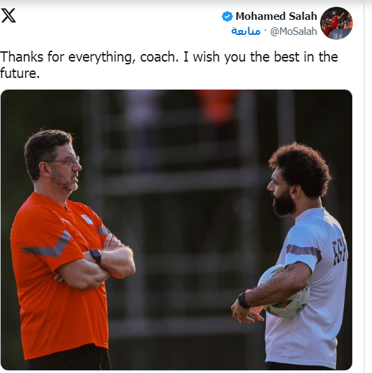 ونشر محمد صلاح صورة تجمعه بـ روي فيتوريا عبر حسابه على موقع التواصل الاجتماعي «إكس»:" شكرا على كل شئ، أتمنى لك الأفضل في المستقبل".