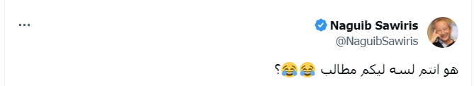 وفي رسالته لإثيوبيا بعد إكمال أعمال سد النهضة، قال رجل الأعمال نجيب ساويرس: "هو أنتم لسه ليكم مطالب..؟"
