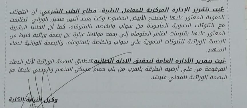ثبت بتقرير الإدارة المركزية للمعامل الطبية - قطاع الطب الشرعي، أن التلوثات الدموية المعثور عليها بالسلاح الأبيض المضبوط وكذا بعدد أثنين منديل الورقي تطابقت مع التلوثات الدموية المأخوذة من سواب والخاصة بالمتوفاه، كما أن الخلايا البشرية المعثور عليها بقليمات اظافر المتوفاة إلى رحمة مولاها عبارة عن بصمة وراثية خليط من البصمة الوراثية للتلوثات الدموية على سواب والخاصة بالمتوفاه والبصمة الوراثية لدماء المتهم.