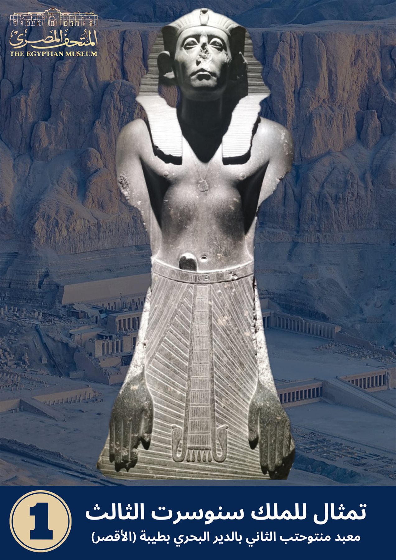 يعرض المتحف المصري بالتحرير، قطعة فريدة لتمثال الملك سنوسرت الثالث، وتم اكتشافها في معبد منتوحتب الثاني بالدير البحري على يد فريق من جمعية استكشاف مصر بقيادة عالم المصريات إدوارد ناڤيل، وكان يضم ستة تماثيل من الجرانوديوريت للملك سنوسرت الثالث من الأسرة الثانية عشر.