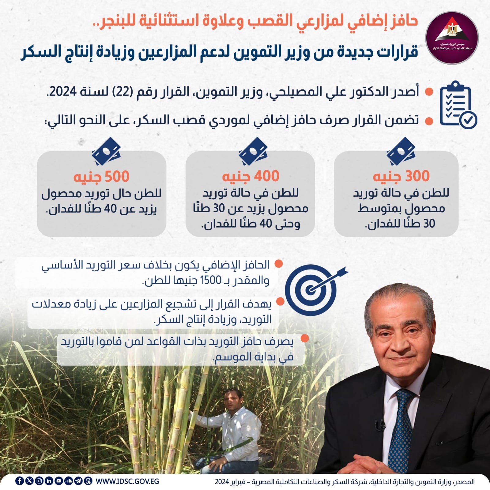 يأتي ذلك سعيًا من الحكومة المصرية لدعم المزارعين وزيادة إنتاج السكر، أصدر الدكتور علي المصيلحي وزير التموين، القرار رقم (22) لسنة 2024، والذي تضمن عدة قرارات، منها صرف حافز إضافي لموردي قصب السكر بقيمة تتراوح من 300 إلى 500 جنيه للطن، بالإضافة إلى السعر الأساسي للتوريد والبالغ 1500 جنيه للطن؛ تشجيعًا للمزارعين على زيادة معدلات التوريد، الأمر الذي يسهم في زيادة إنتاج السكر.