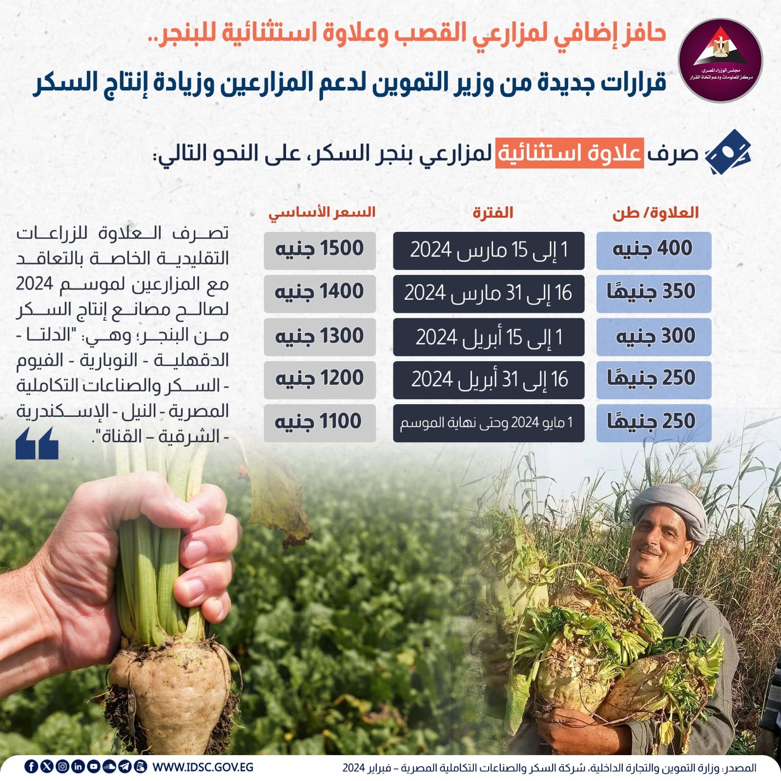 وزير التموين قرر صرف علاوة استثنائية لمزارعي البنجر وفقا للزراعات التقليدية الخاصة بالتعاقد مع المزارعين لموسم 2024 لصالح مصانع إنتاج السكر من البنجر، وهي: "الدلتا - الدقهلية - النوبارية - الفيوم - السكر والصناعات التكاملية المصرية - النيل - الإسكندرية - الشرقية – القناة"، وتتراوح العلاوة الاستثنائية من 250 حتى 400 جنيه للطن، بخلاف سعر التوريد الأساسي والبالغ 1500 جنيه للطن.